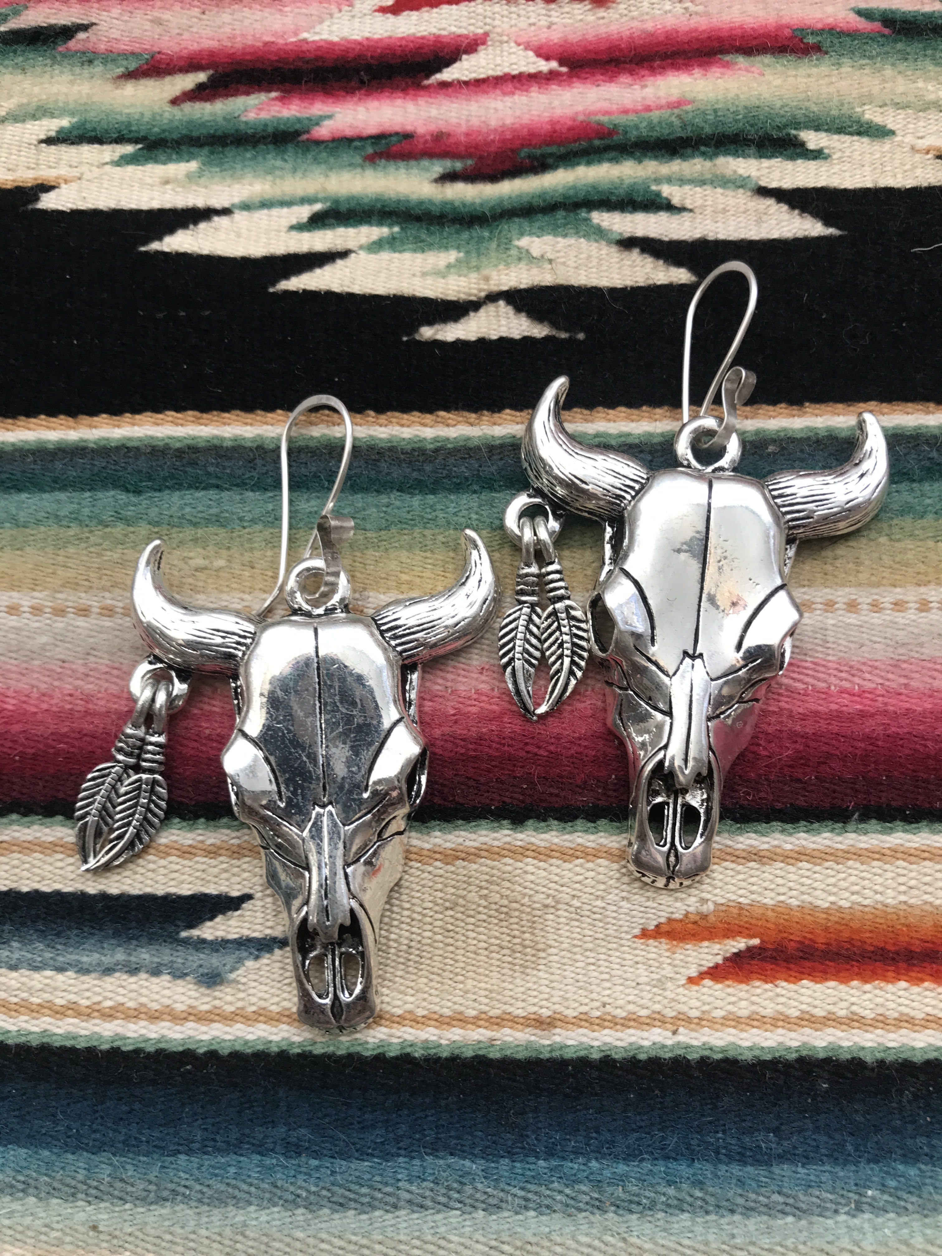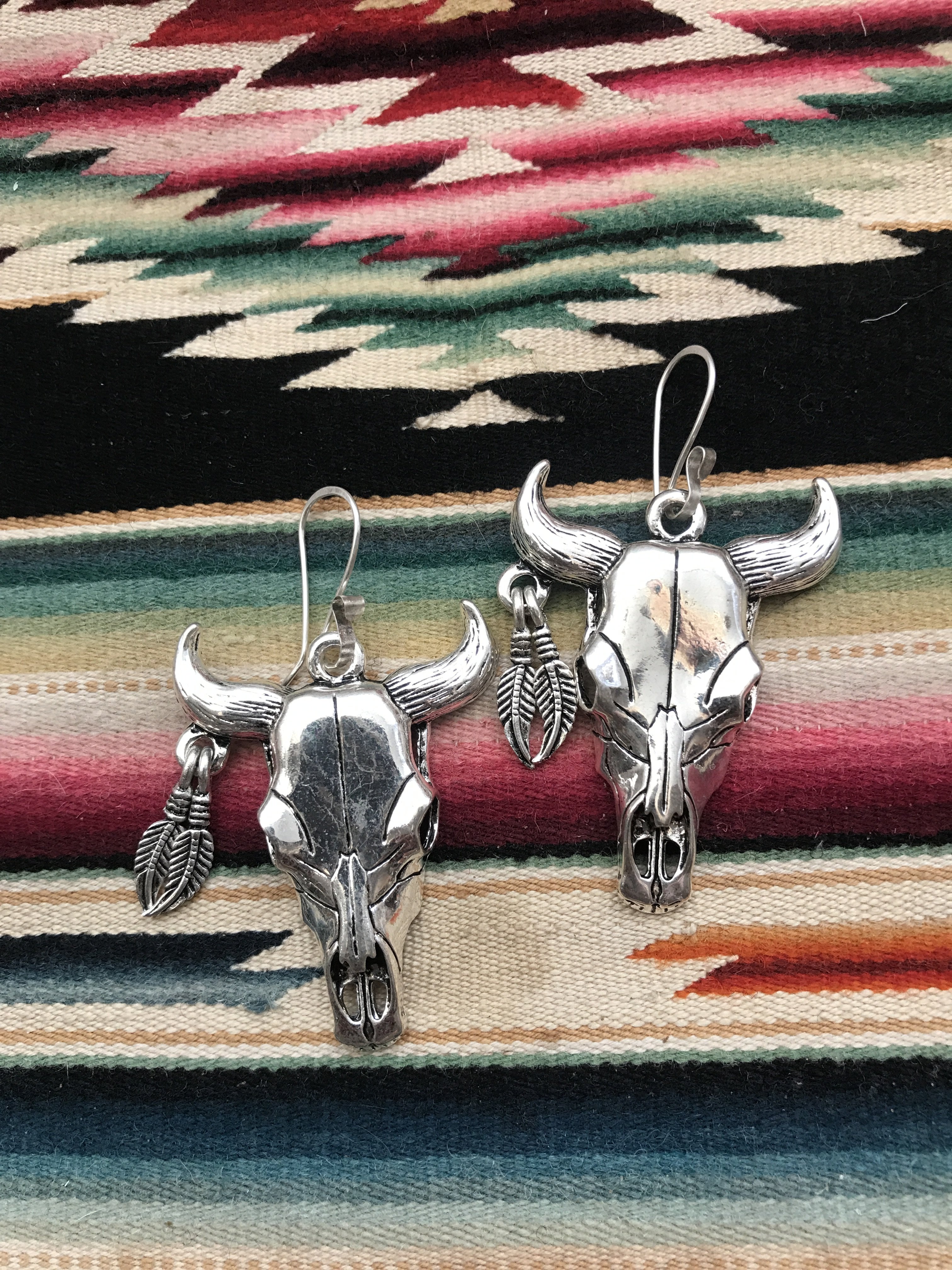 Silver Plated Steer Skull Earrings with Feathers. These earrings are Lightweight Steerskulls with feathers, they will look great on your cowgirl with your favorite Serape pancho.