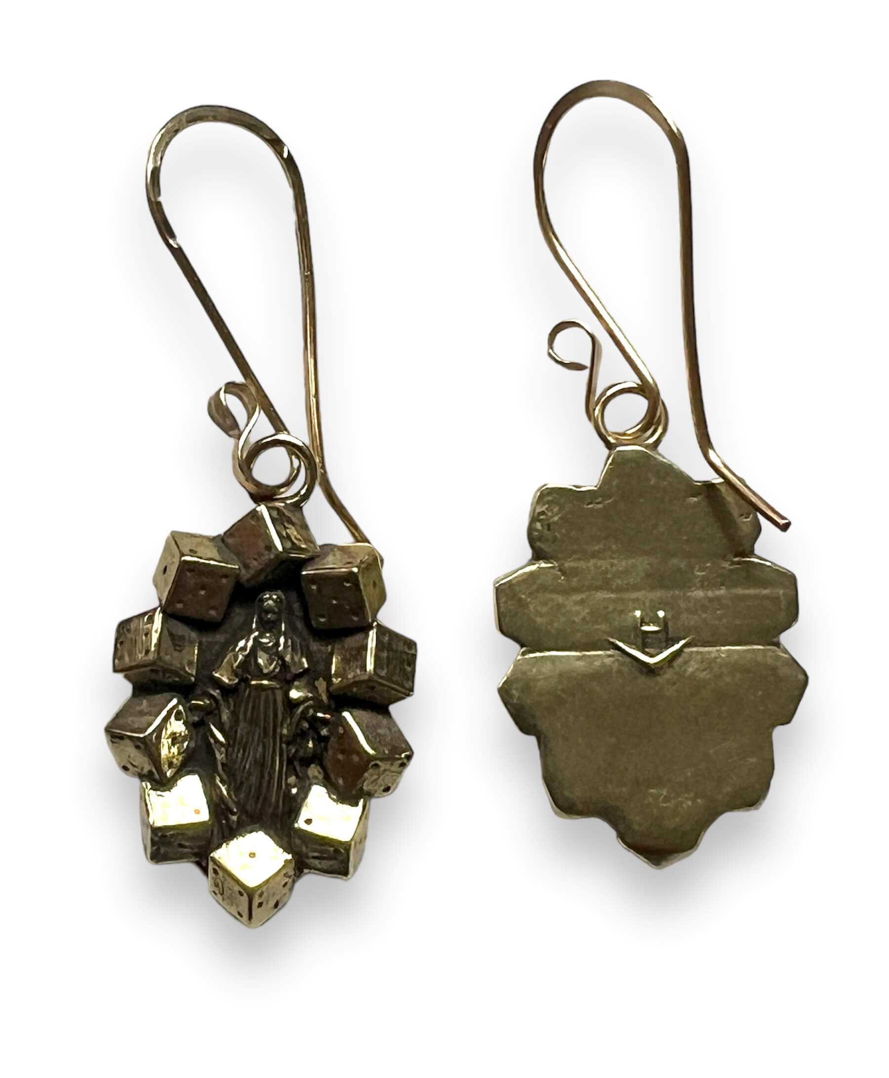 Virgin Mary Lucky Dice Earrings: These revvv’d up, handmade, Earrings are modeled after The Blessed Virgin Mary surrounded with multiple lucky dice. These earrings are made to order, in your choice of metal. This handmade piece is created using the lost wax casting method. The piece is carved in wax, sized, and then cast.