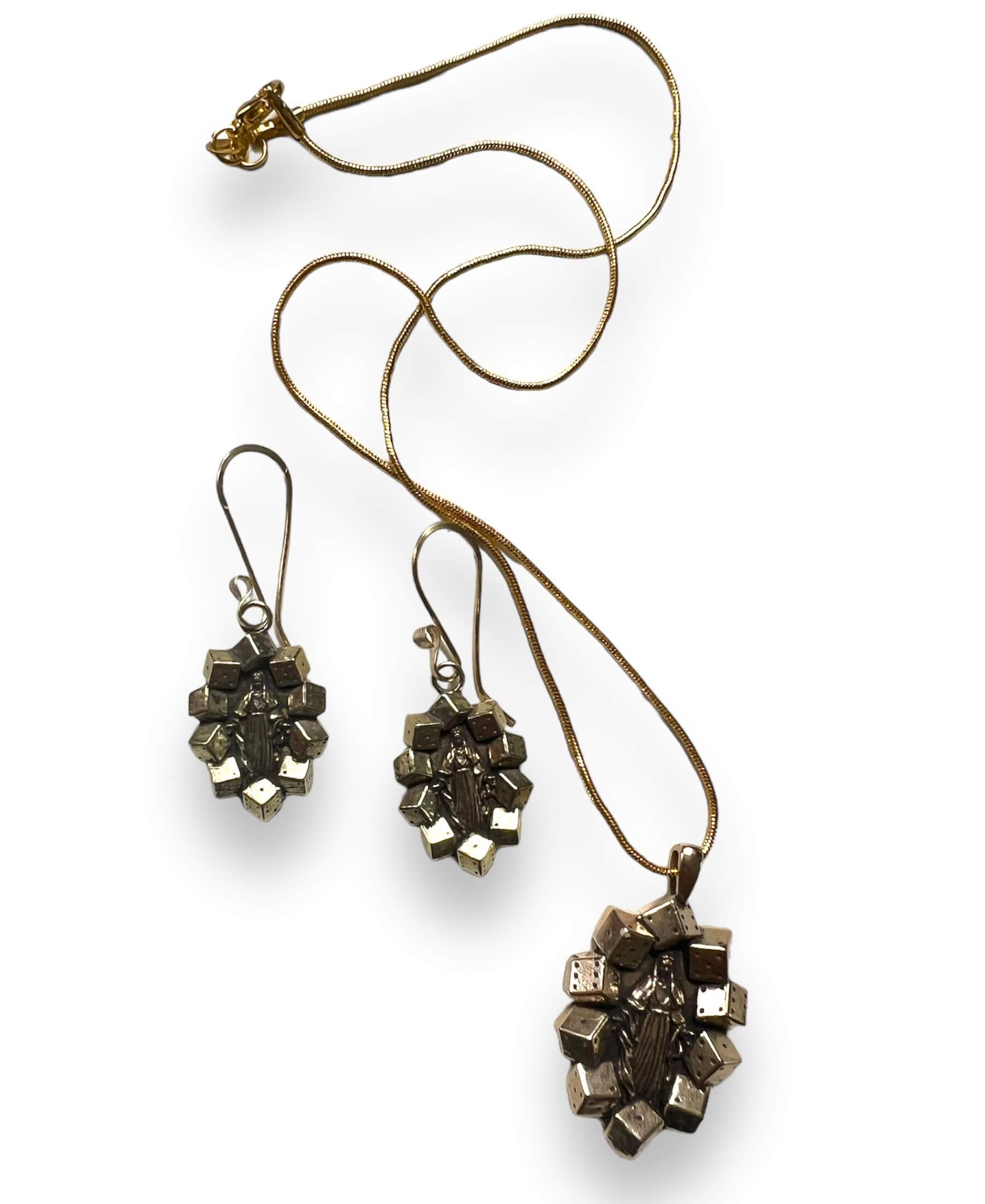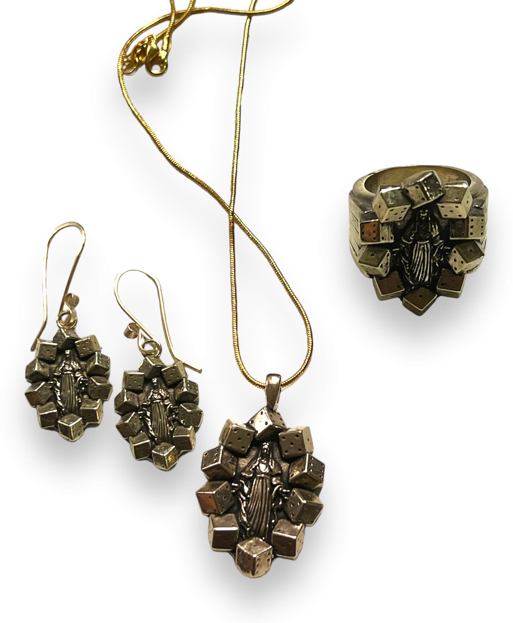 These earrings are a part of a beautiful matching set with a ring and necklace as well. Find them on our website under Virgin Mary Lucky Dice in the search bar.