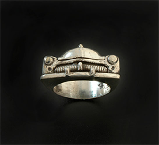 1949 Mercury Ring Factory Grille look Ring. This revvv’d up, handmade, silver ring is modeled after a 1949 & 1950 Mercury Lead Sled. This ring is made to order and to the size you need. This handmade silver piece is created using the lost wax casting method. The piece is carved in wax, sized and then cast. This particular design can come with crystals in the headlights and also with a black antiquing to give the look of flat black primer.