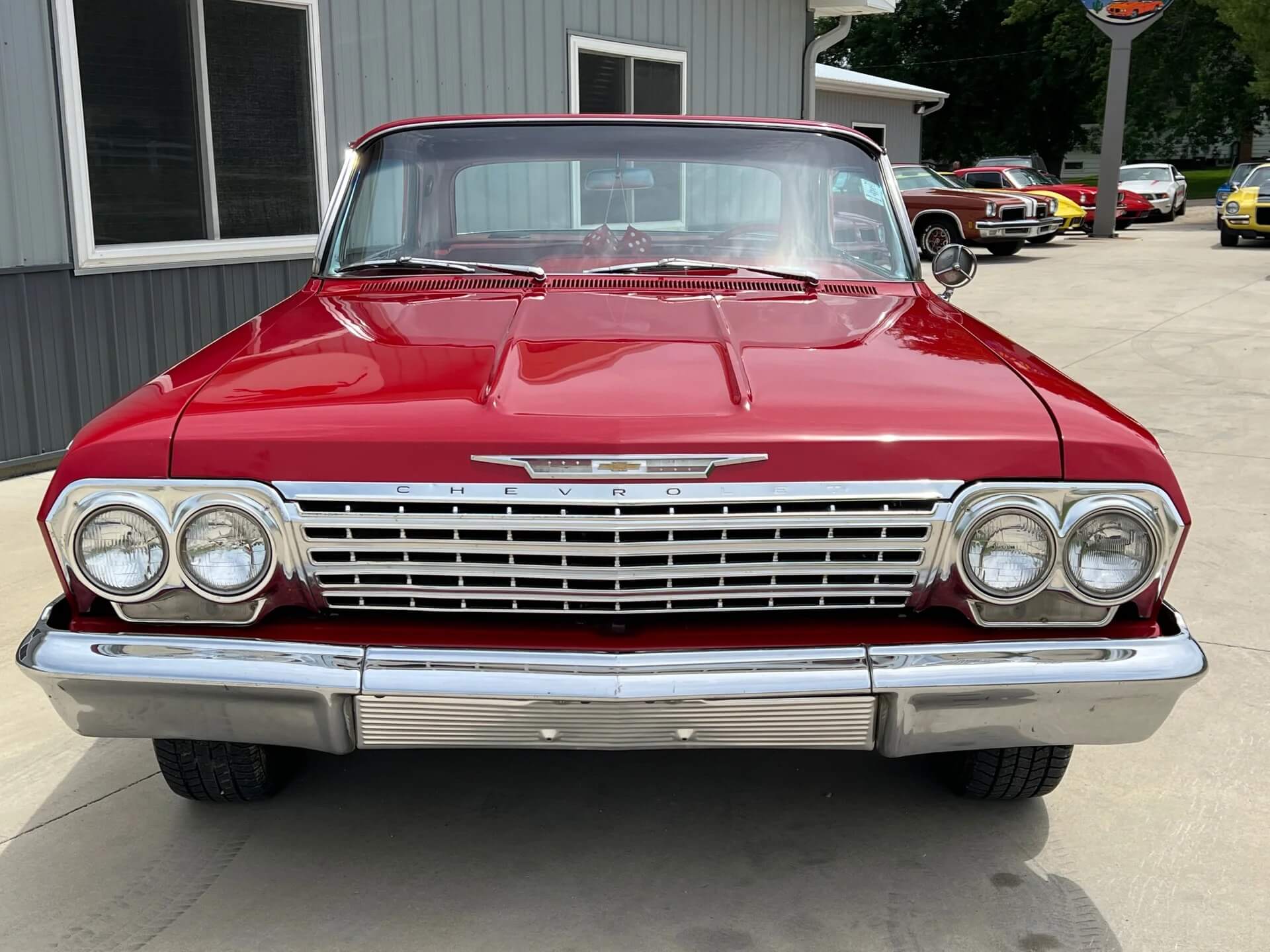 Designed to evoke the iconic front-end styling of the 1962 Impala — the bold grille lines, the quad headlights, and the low-rider stance (hydraulics implied) — making it a statement piece for automotive enthusiasts.