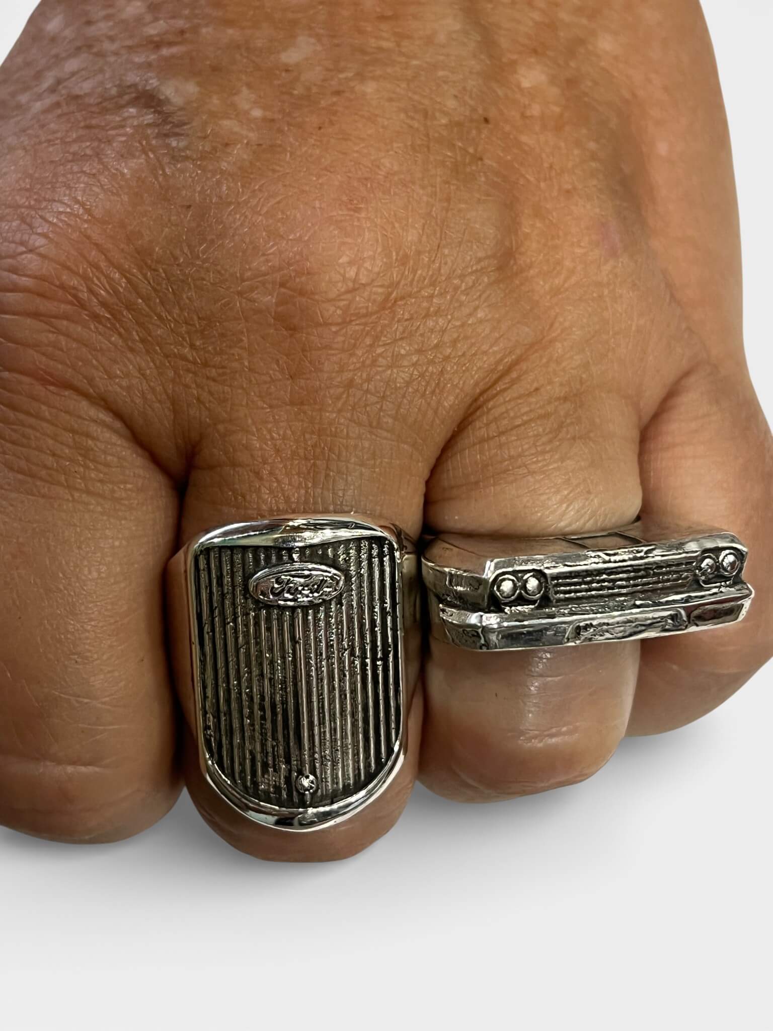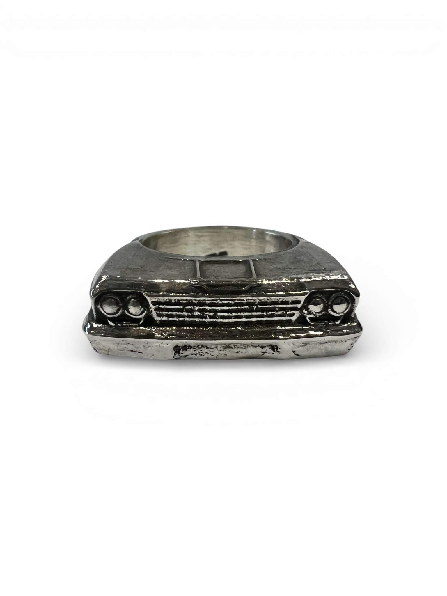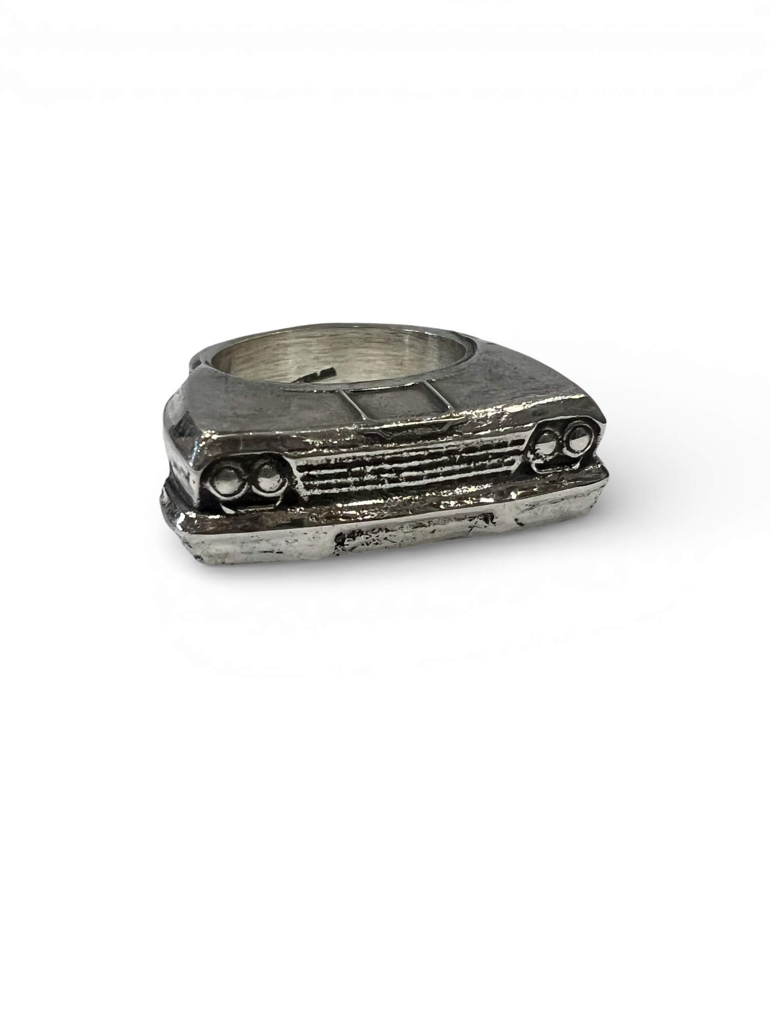 1962 Chevy Impala Car Grille Ring. This revvv’d up, handmade, silver ring is modeled after a 1962 Chevrolet Impala. The Ultimate Lowrider. This ring is made to order and to the size you need. This handmade silver piece is created using the lost wax casting method. The piece is carved in wax, sized and then cast. If you want to pimp your lowrider out more we can gold plate the details.