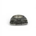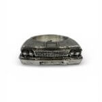 Finished in polished silver with optional oxidized details (blackened recesses) to enhance the high-relief car design and give vintage depth.
