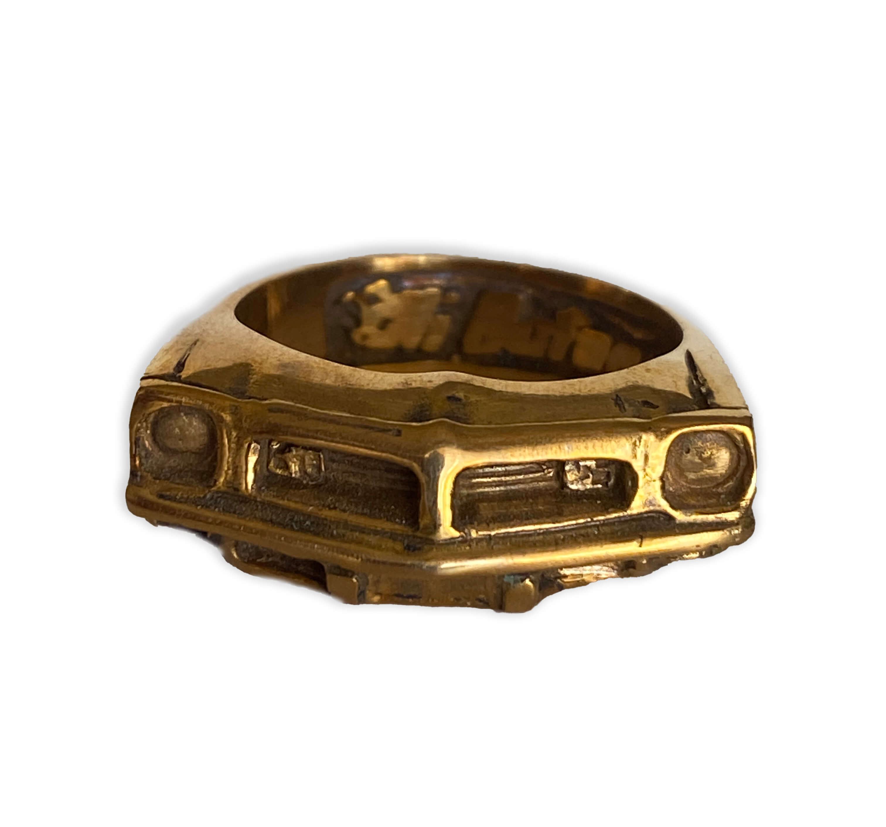 1975 Pontiac Trans Am Ring. This revvv’d up, handmade, silver ring is modeled after a 1975 Pontiac Trans Am Ring, muscle car. This ring is made to order and to the size you need. This handmade piece is created using the lost wax casting method. The piece is carved in wax, sized and then cast.