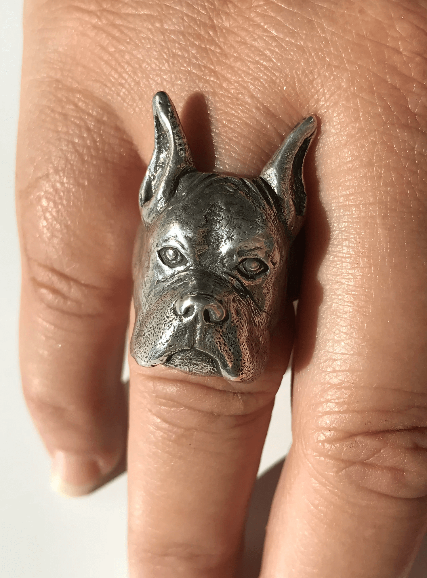 This ring is designed to look like an American or German Boxer Dog.