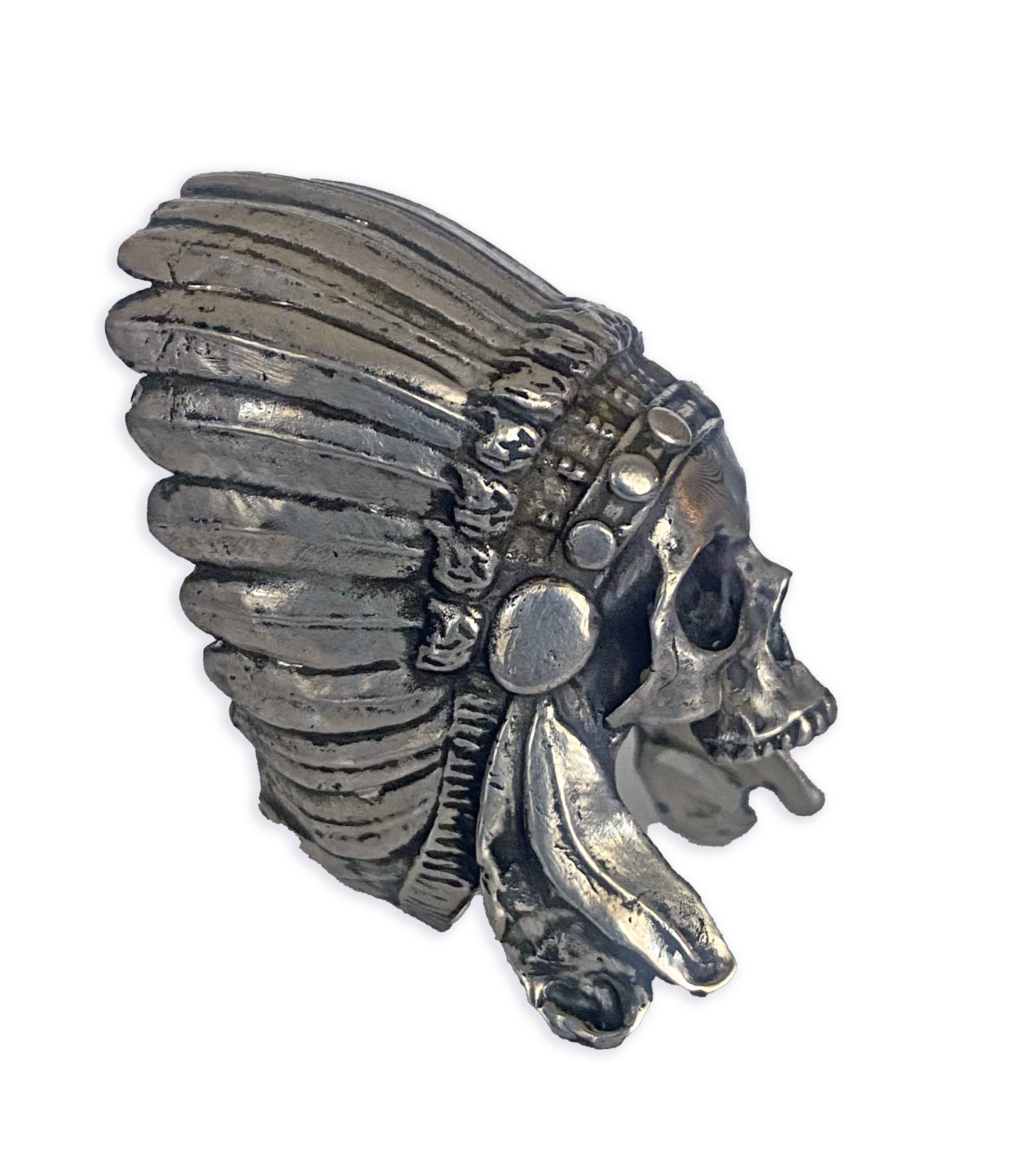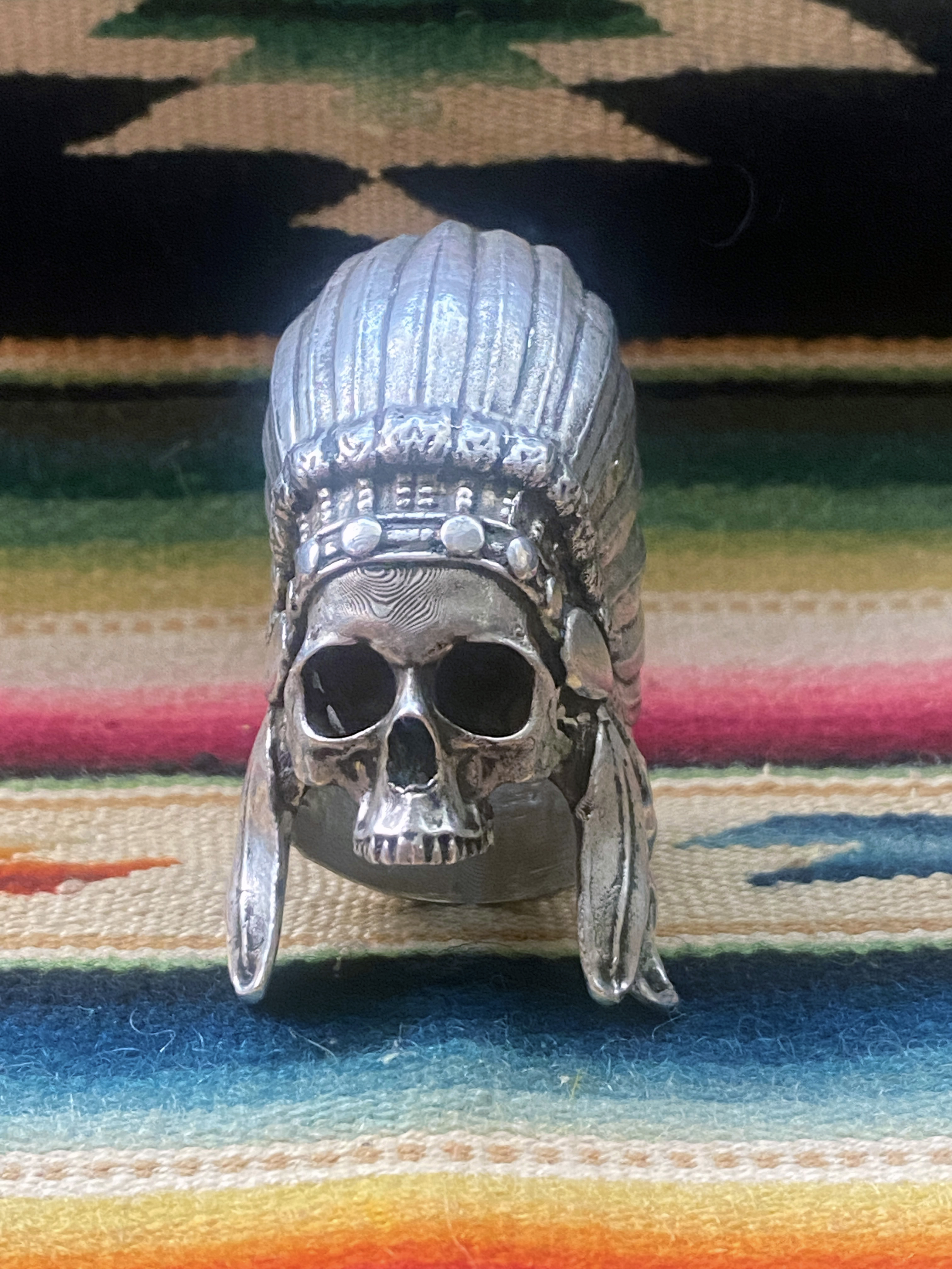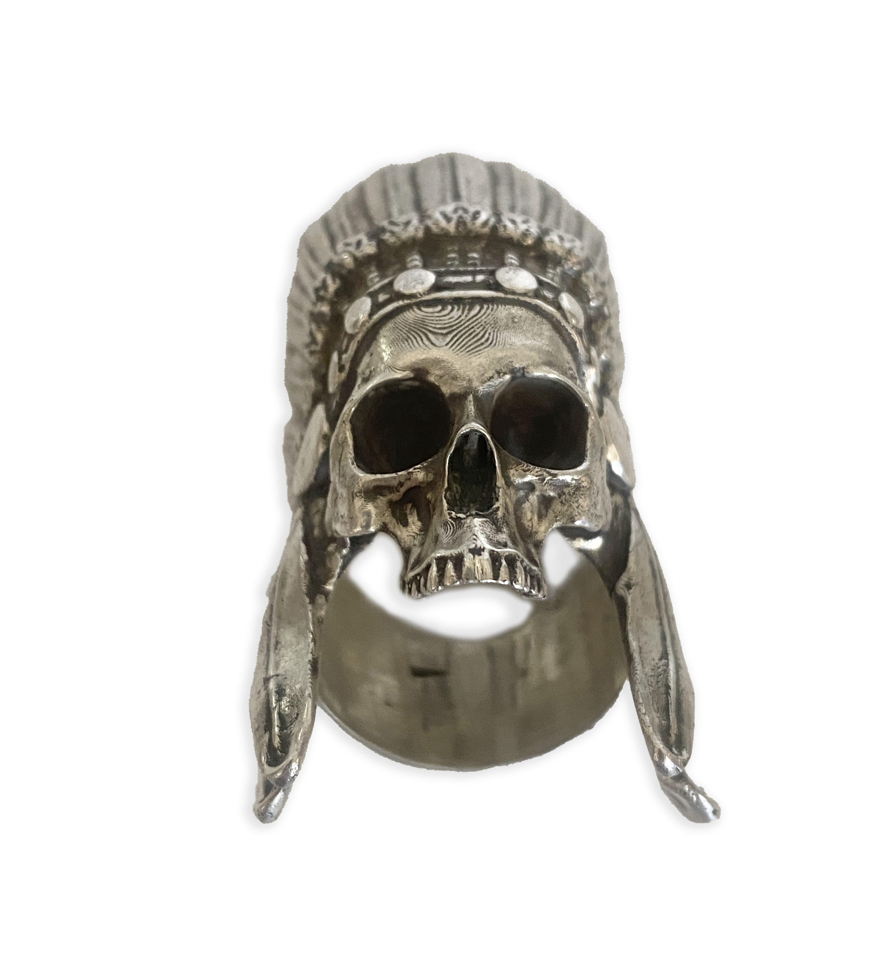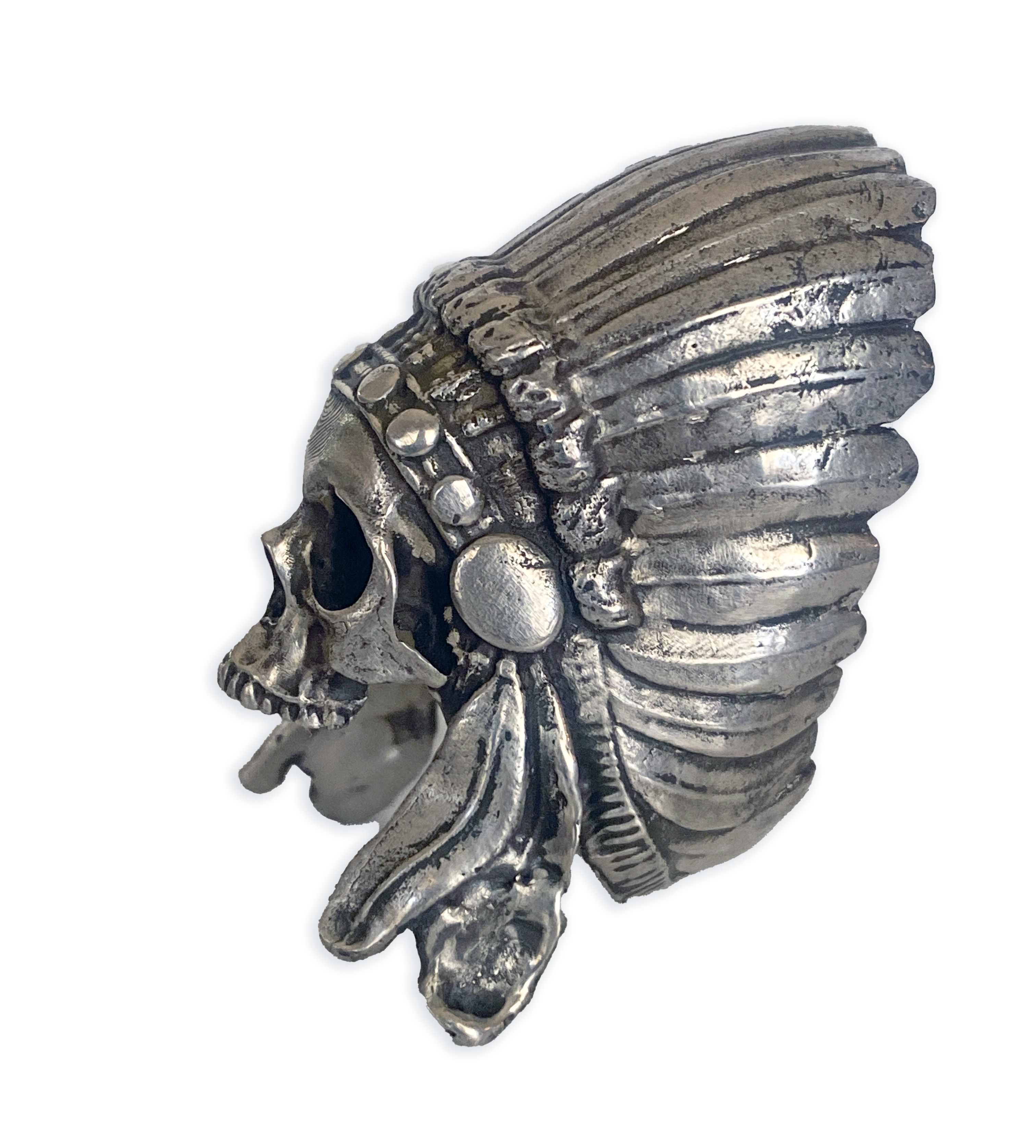 This Large Indian Chief Skull Ring is 3D printed in castable wax on our 3D printer. Then we cast the ring using the Lost wax Casting Method. The ring is available in a variety of metals.