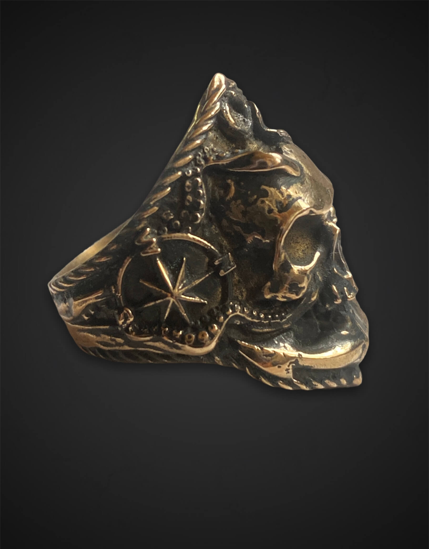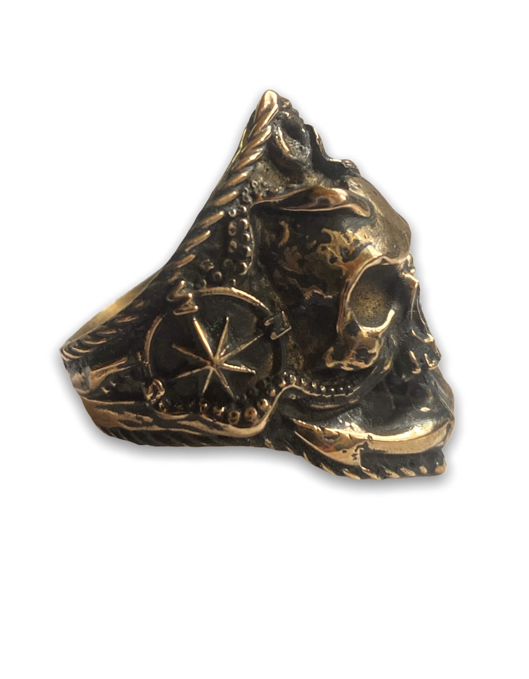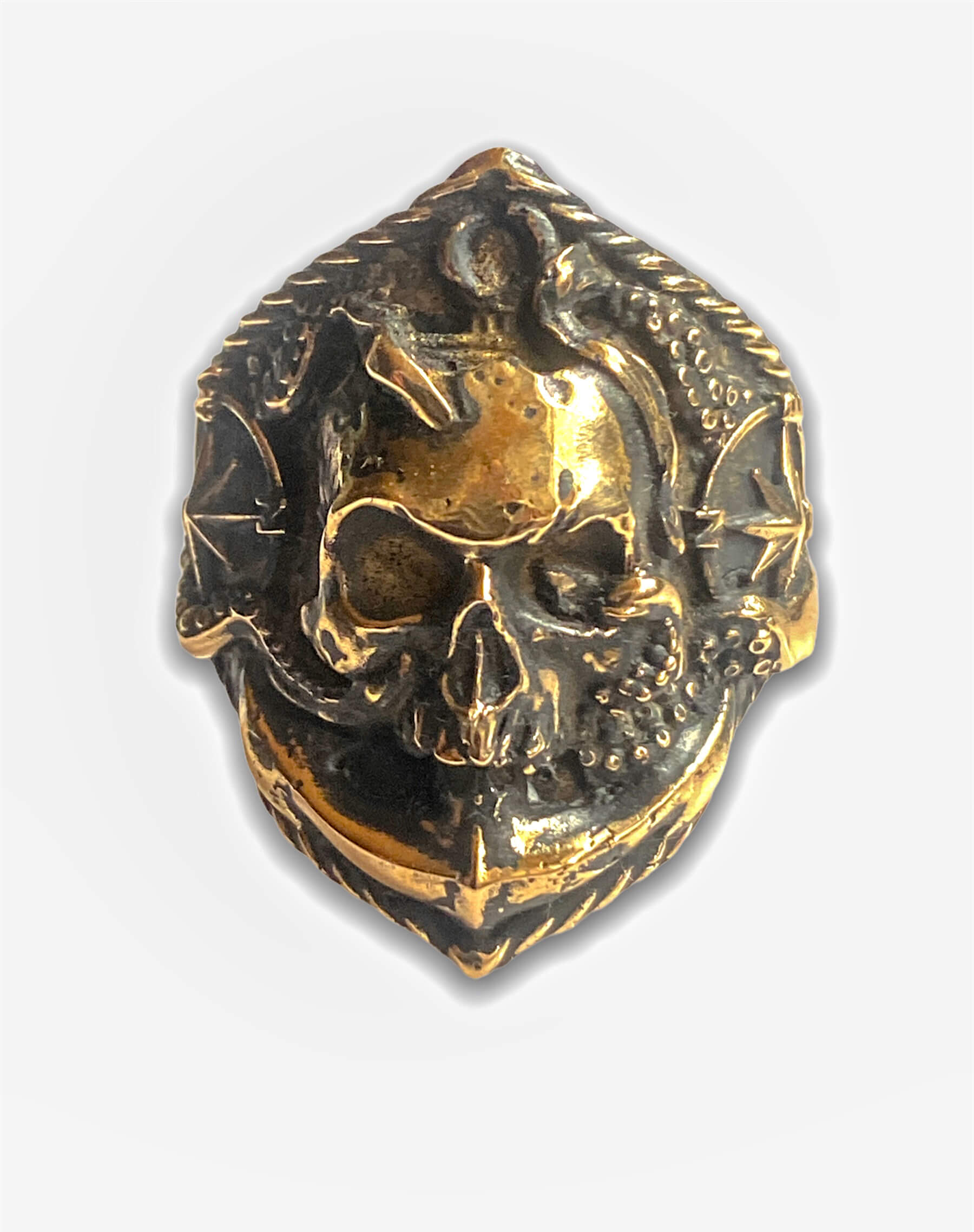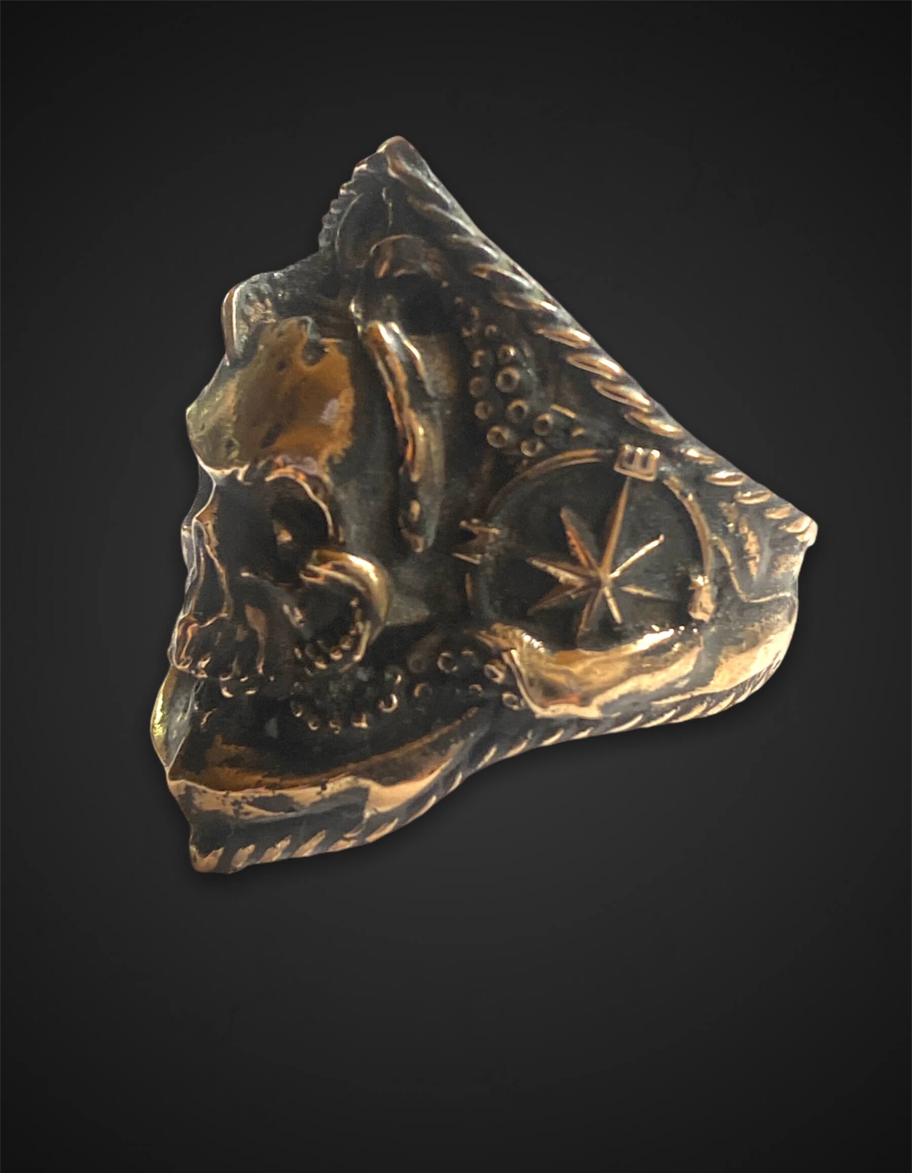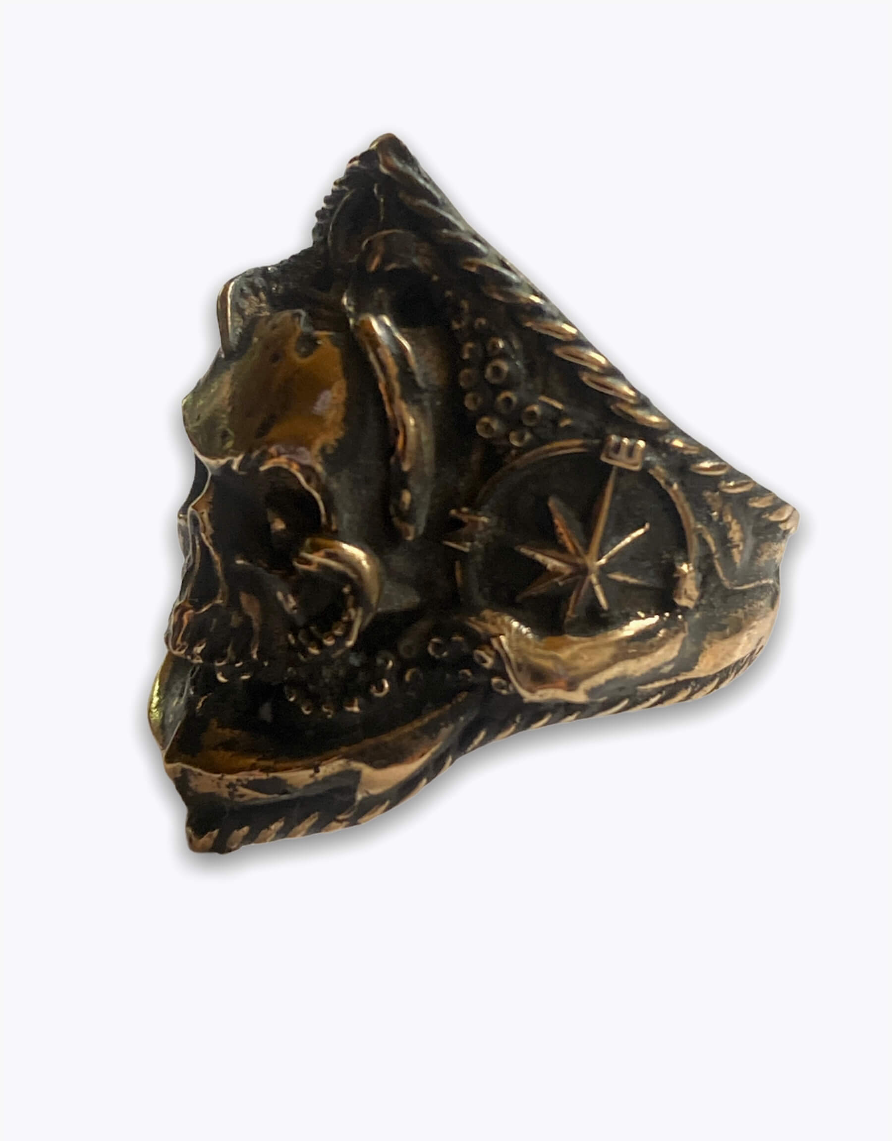 This handmade Seafarer ring is inspired by the ocean, Davey Jones, and sailing. It features a skull, anchor, octopus, and compass. It is created using the lost wax casting method. We design this ring in 3D software on the computer, print it in Castable wax-resin, size it, and then cast in the metal of your choice.