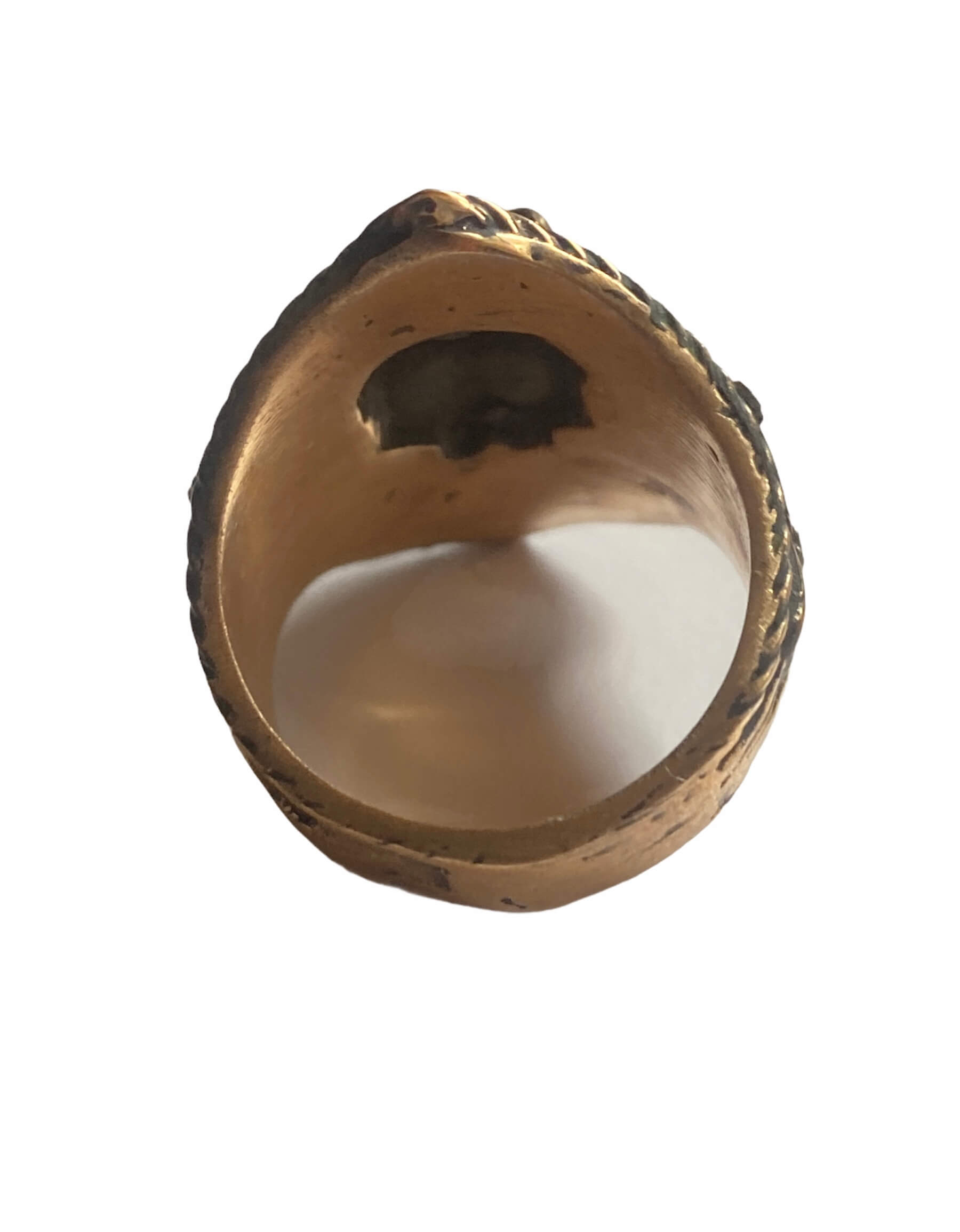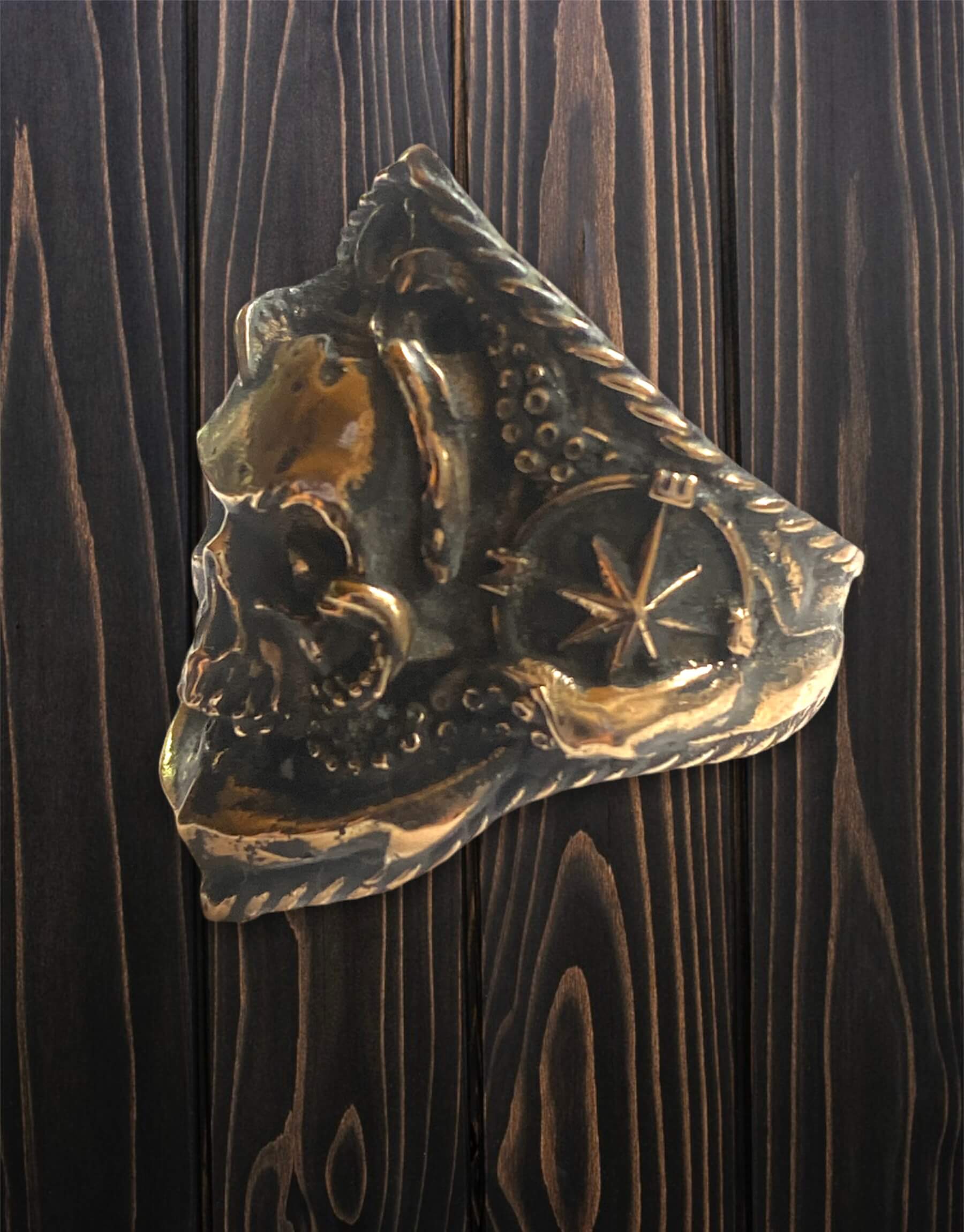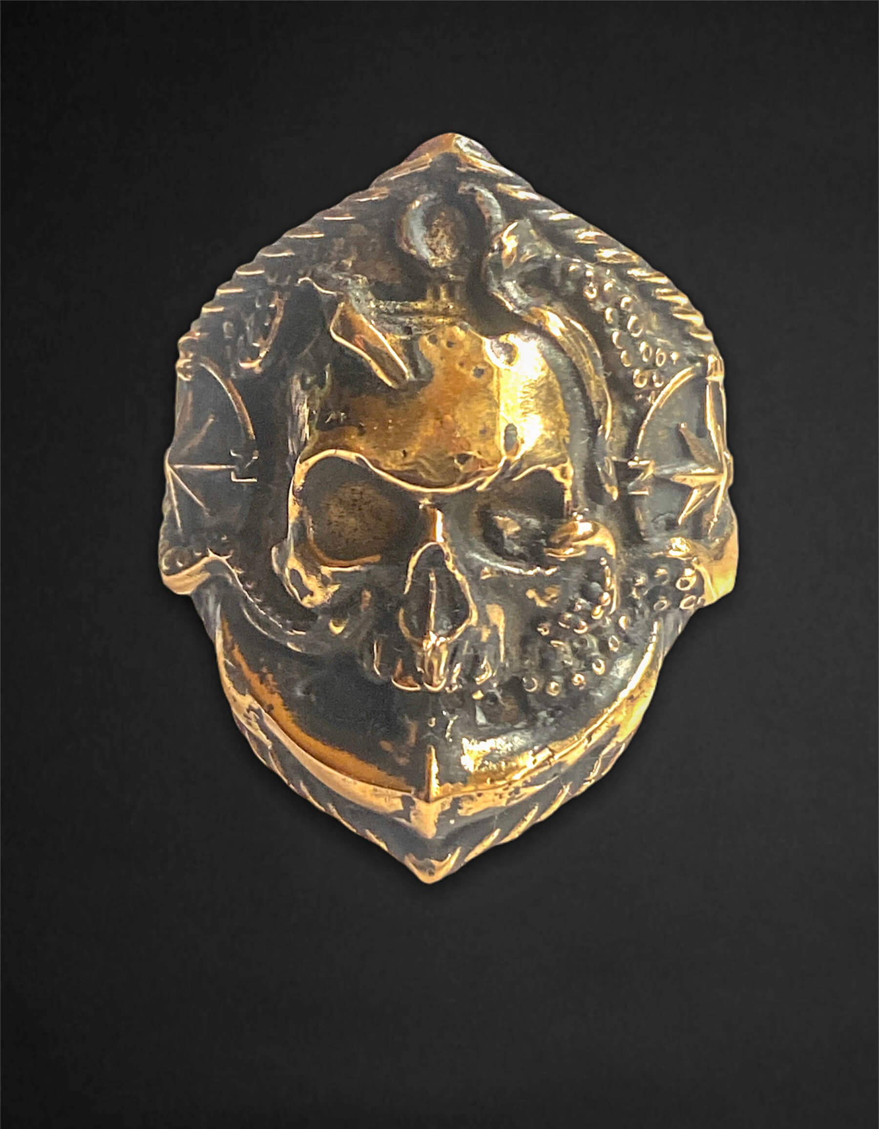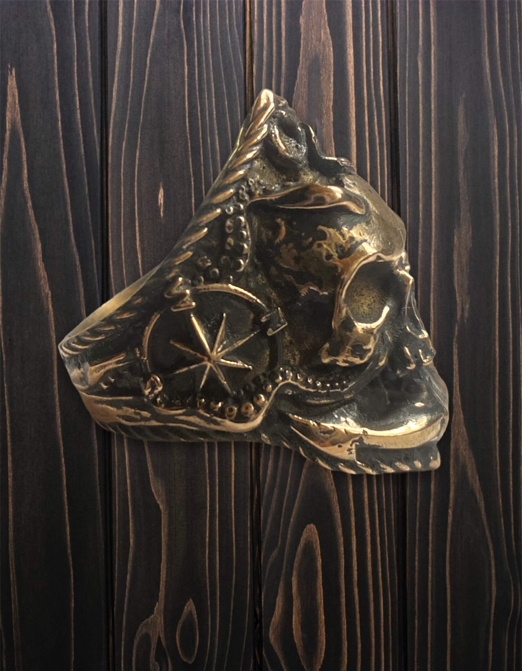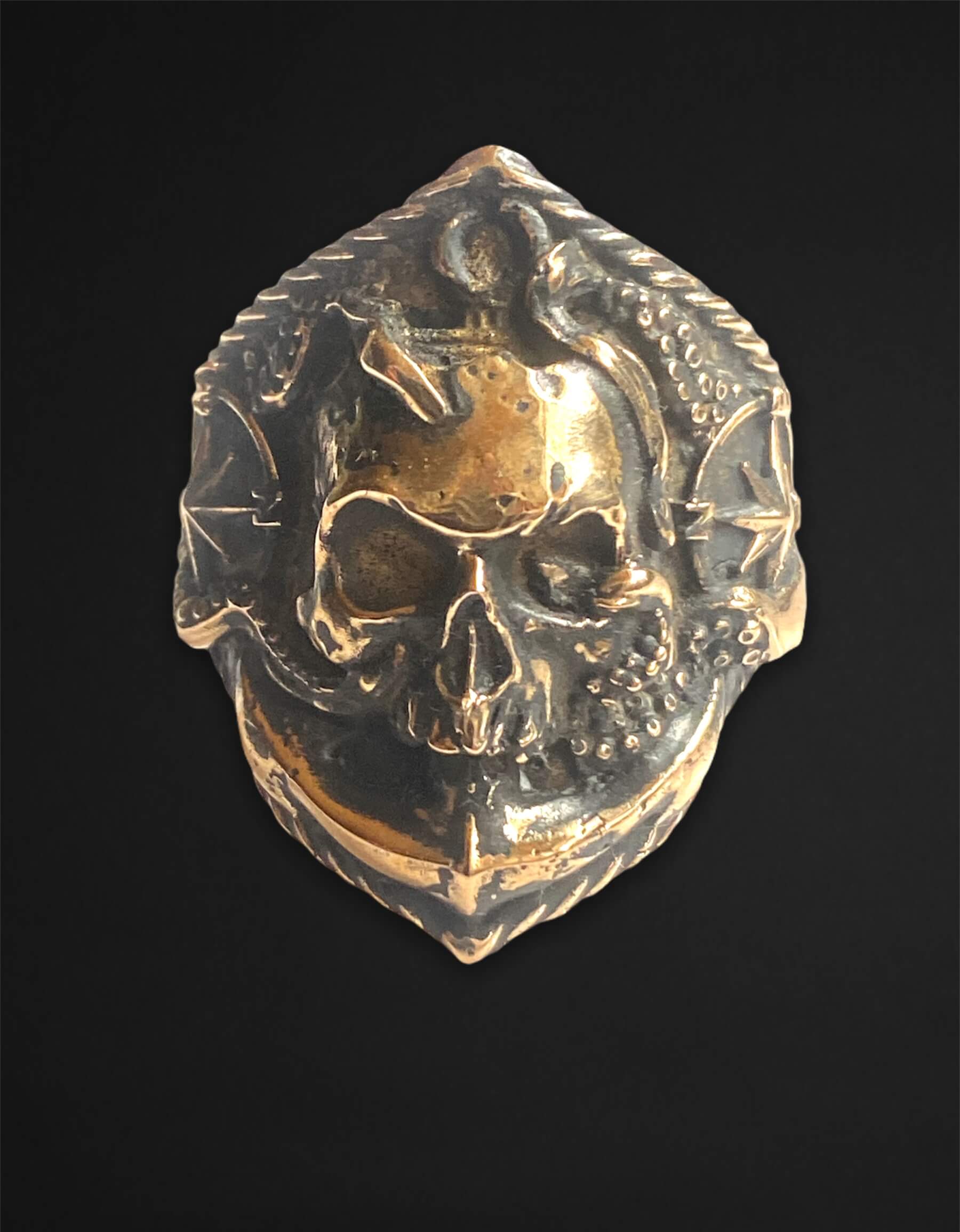 This handmade Seafarer ring is inspired by the ocean, Davey Jones, and sailing. It features a skull, anchor, octopus, and compass. It is created using the lost wax casting method. We design this ring in 3D software on the computer, print it in Castable wax-resin, size it, and then cast in the metal of your choice.
