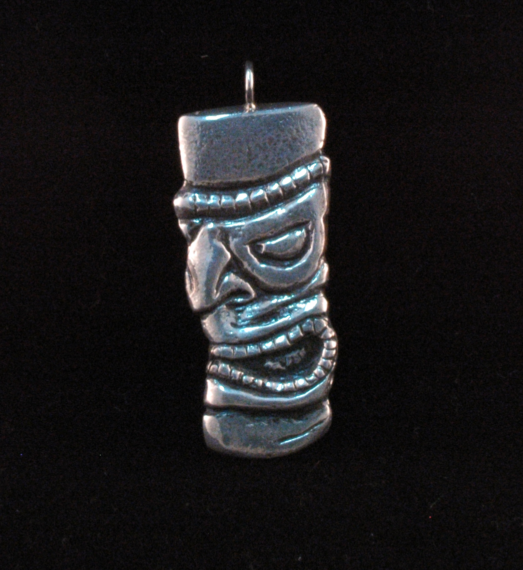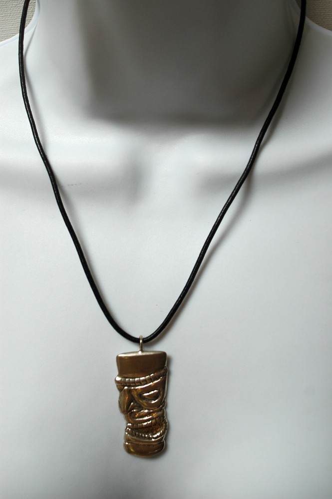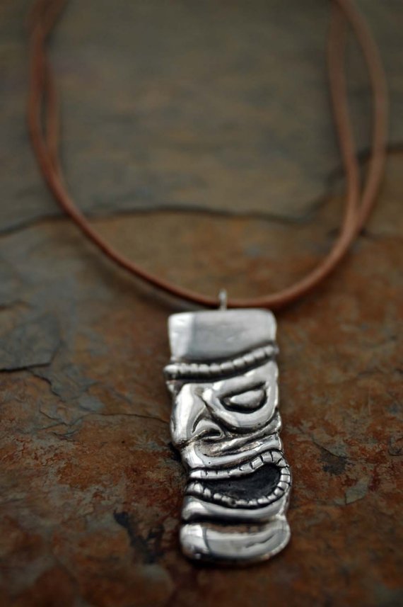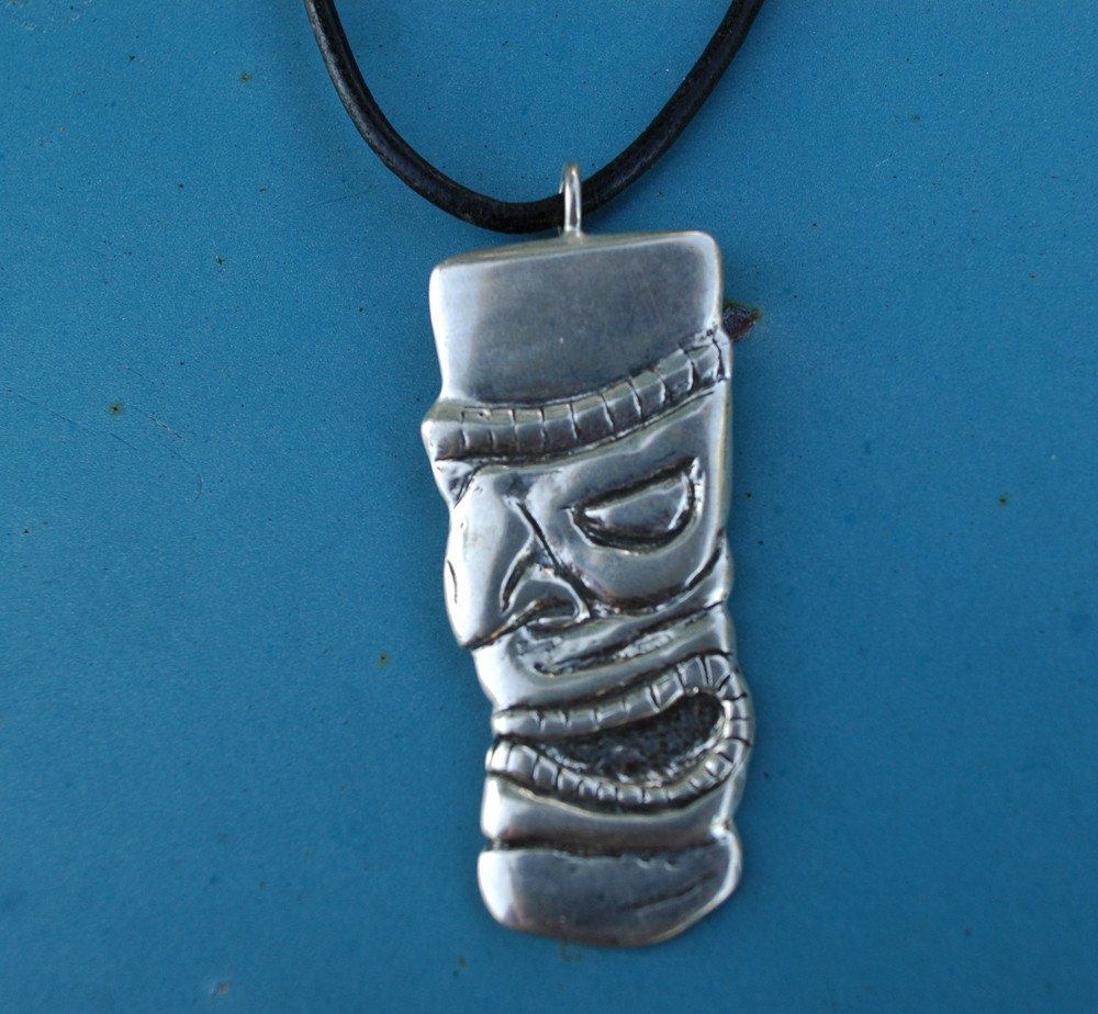 This handmade necklace pendant is created using the lost wax casting method in your choice of metal. The tiki is carved in wax and then cast. Tiki Measures is 2.25″H.
